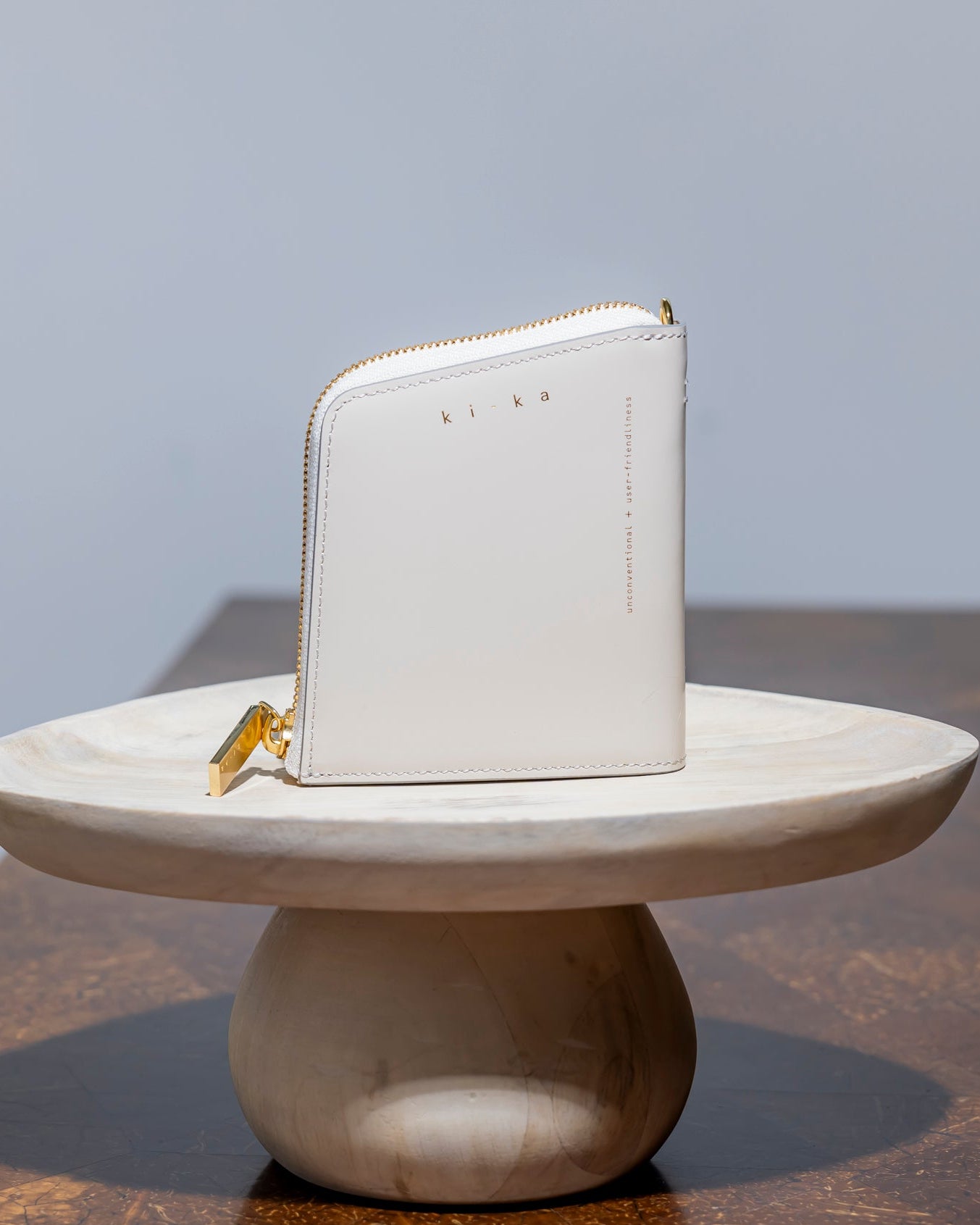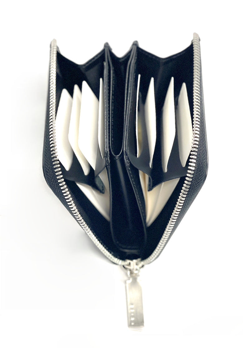 意匠登録済みの、直線でも曲線でもない独自のフォルムに、ガラスレザーならではの透明感と奥行きのある艶をまとわせました。